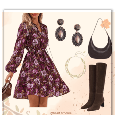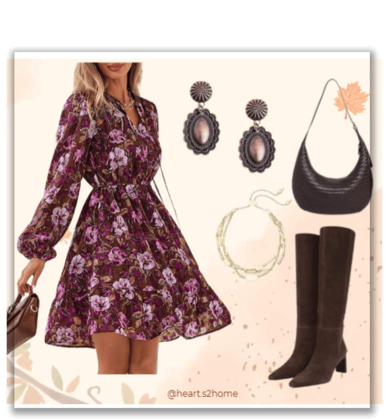 This look is all about effortless elegance with a touch of boho charm. The floral dress in deep plum and brown tones is perfect for Thanksgiving — soft, feminine, and flowy enough to keep you comfortable all day long.